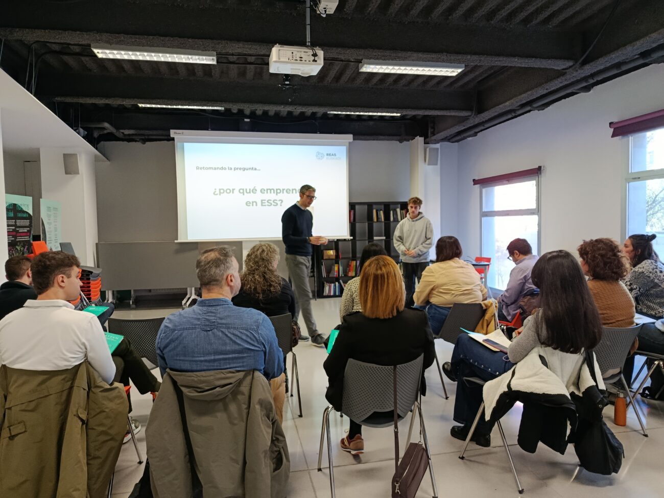Esta sesión inaugural se enmarcó también dentro de Ekonopolo Formakuntza, con una primera parte abierta al público. En ella, Jagoba Bueno (REAS Euskadi) y Gari Ayuela (Inbiku) abordaron cómo convertir una idea en un proyecto viable dentro de la ESS, repasando el papel de REAS Euskadi: desde los principios éticos y la visión de la ESS, hasta herramientas como la Auditoría Social y el Mercado Social.
