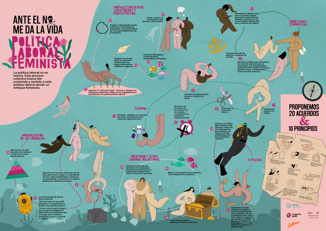 Mugarik Gabe, REAS Euskadi y Setem Hego Haizea presentamos una publicación de diez principios y veinte acuerdos para avanzar hacia una Política Laboral Feminista. La guía, que puede descargarse aquí, es parte de un proceso de reflexión colectivo iniciado por las tres organizaciones que busca ahora sumar alianzas para seguir profundizando en un modelo laboral habitable.